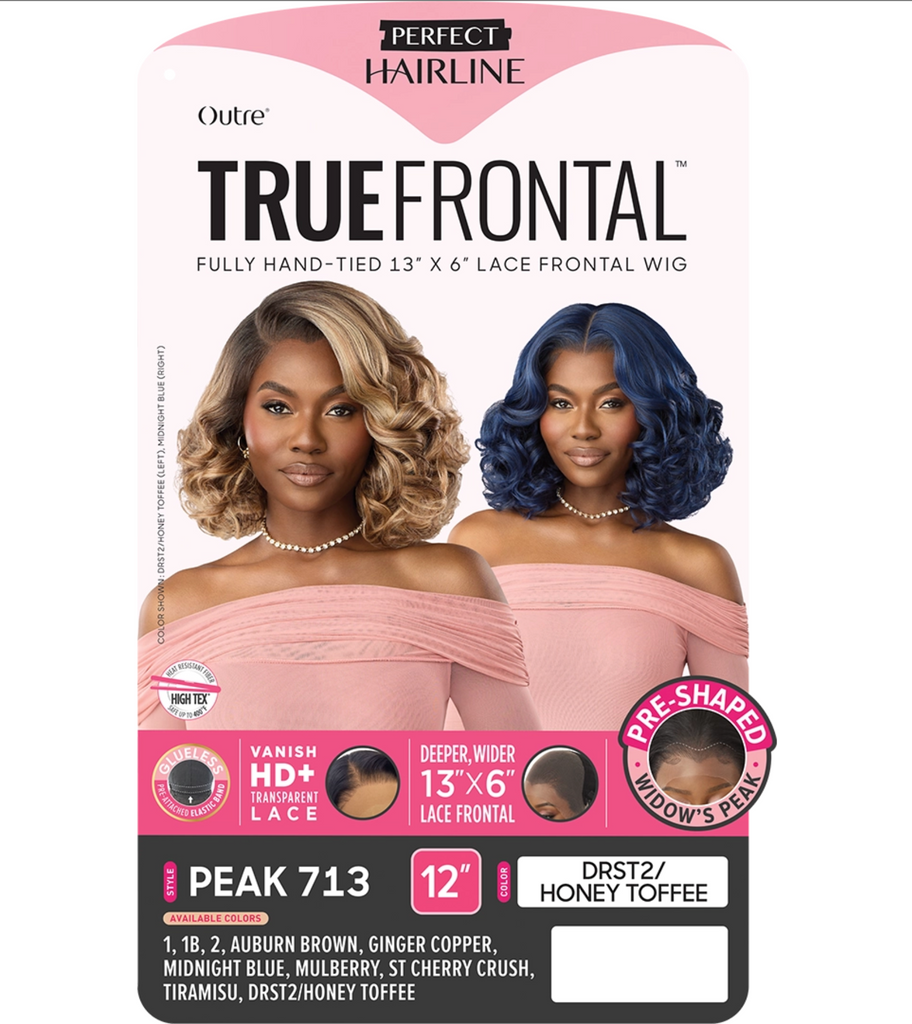 Achieve the ultimate natural look with the Outre Perfect Hairline True Frontal - Peak 713, boosted with 6” of deeper, wider lace at the temples, and featuring a fully hand-tied 13x6 lace frontal for maximum styling versatility. Designed with Vanish HD Transparent Lace, this unit blends seamlessly with your skin, while the pre-shaped widow’s peak creates a unique, natural hairline. With its glueless construction, this frontal provides a secure, hassle-free fit, perfect for effortless wear.