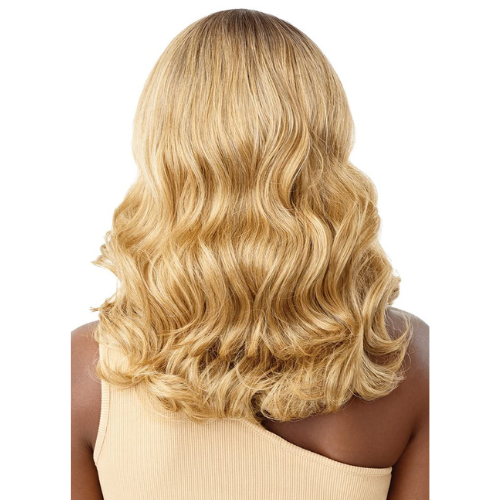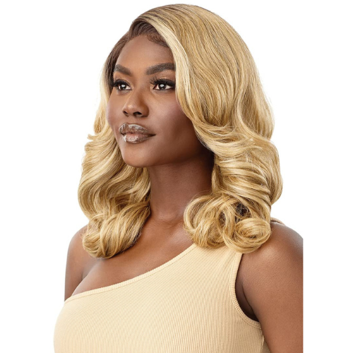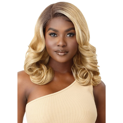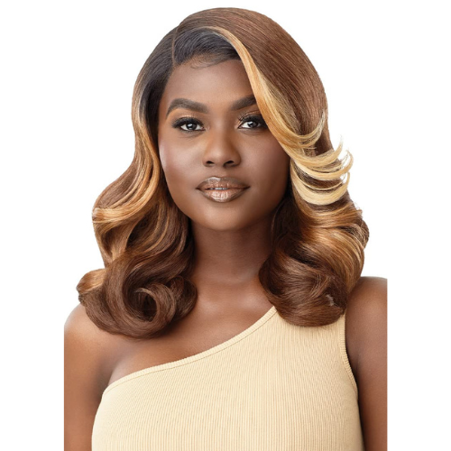 The Flara by Outre is a long style with a side C-part and luscious curls. Part of the Sleek Lay series, this lace front is made with HD lace for a natural but glam look. Available in natural and warm shades.